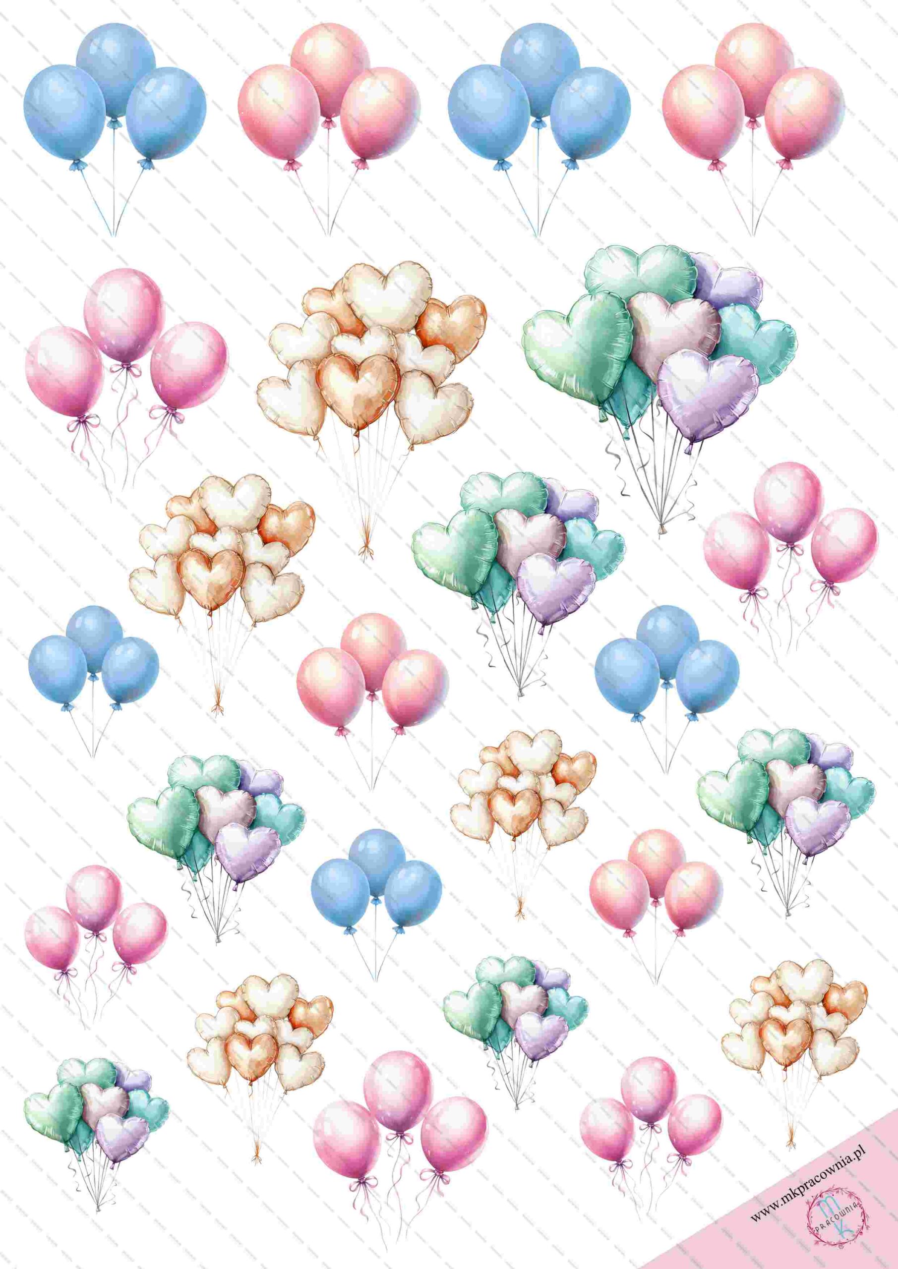 - Arkusz grafik do samodzielnego wycinania – balony o różnych wielkościach, kolorach i kształtach