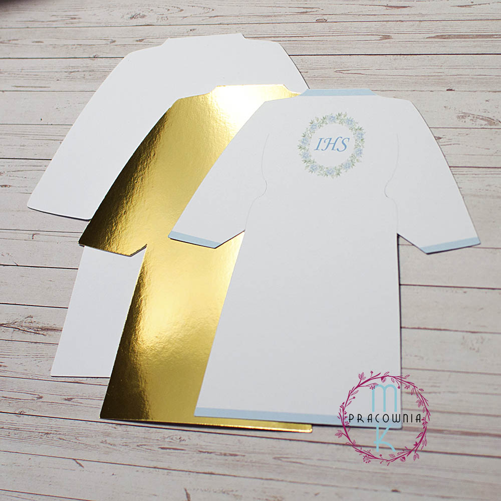 • W zestawie (baza + 2 warstwy)  z bazą otrzymasz dodatkowy papier lustrzane złoto, który jest pomniejszony od bazy oraz biały papier fotograficzny matowy z nadrukiem, który jest pomniejszony od lustrzanego papieru, dzięki czemu powstają warstwy