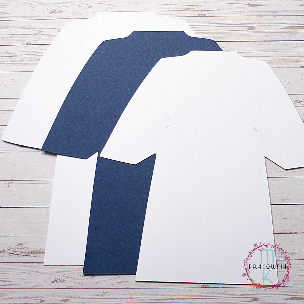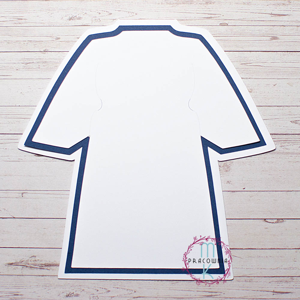- na białym papierze, (który jest nad niebieskim) po bokach zrobione są wcięcia, przez które można przełożyć wstążkę. Nad i pod wcięciem przebiegają delikatne szare nadrukowane linie, które modelują albę