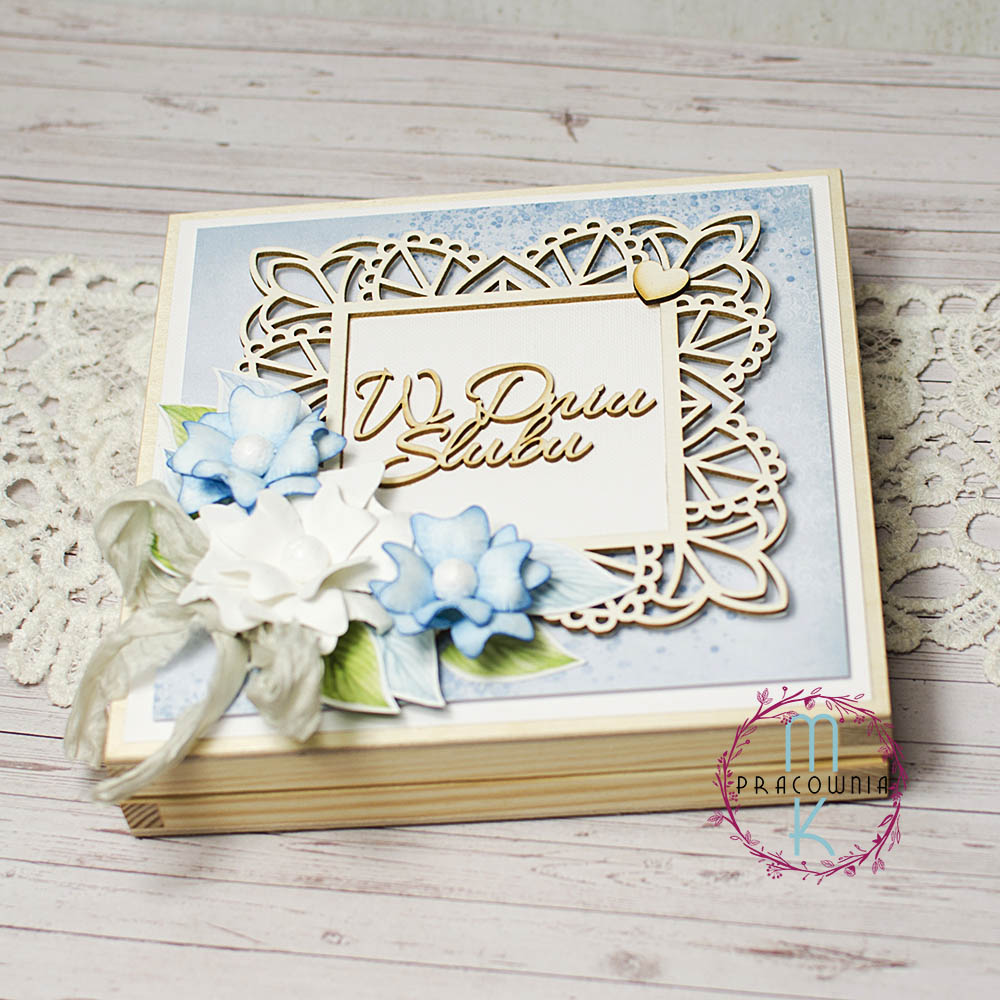 Unikalne drewniane pudełko o wymiarach ok. 14,5 x 14,5 cm, stworzone jako niezapomniana pamiątka z okazji ślubu. Ozdobione wysokiej jakości papierem dekoracyjnym (gramatura 220-250g) zarówno na zewnątrz, jak i w środku, zachwyca wyjątkową dbałością o detale.