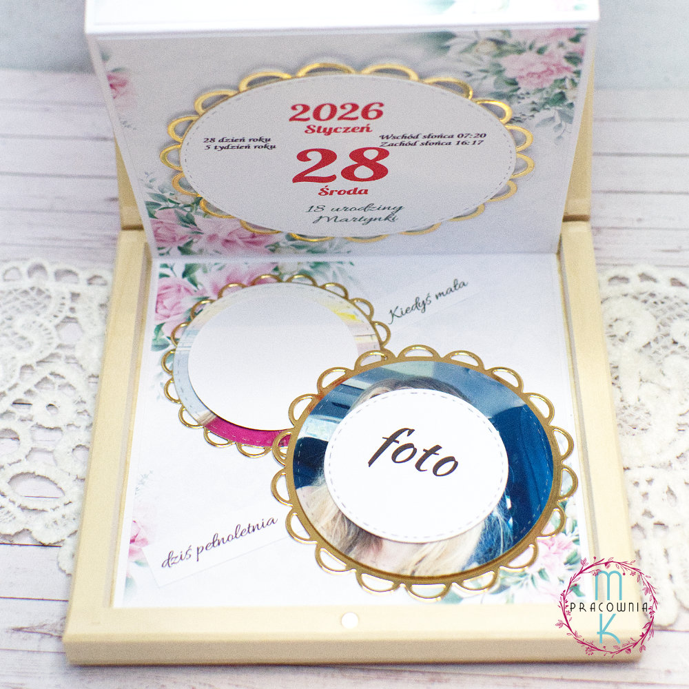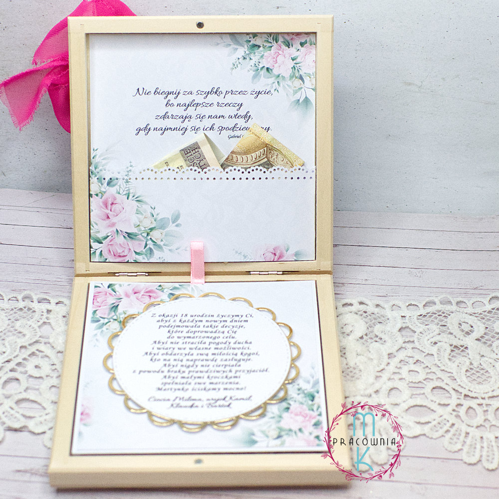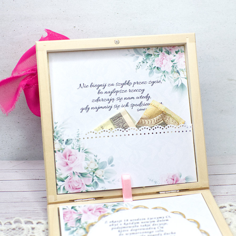 Po otwarciu drewnianego pudełka odkrywasz starannie zaprojektowane wnętrze. W środku umieszczam kieszonkę na pieniądze, a za pomocą wstążki wysuwasz kolejne elementy pamiątki. Kaskadowo odsłaniają się życzenia, kartka z kalendarza oraz zdjęcia solenizantki – jedno z dzieciństwa i drugie aktualne, podkreślające symboliczne przejście w dorosłość.
