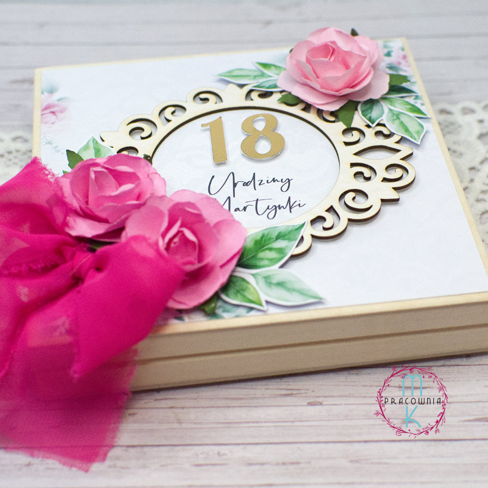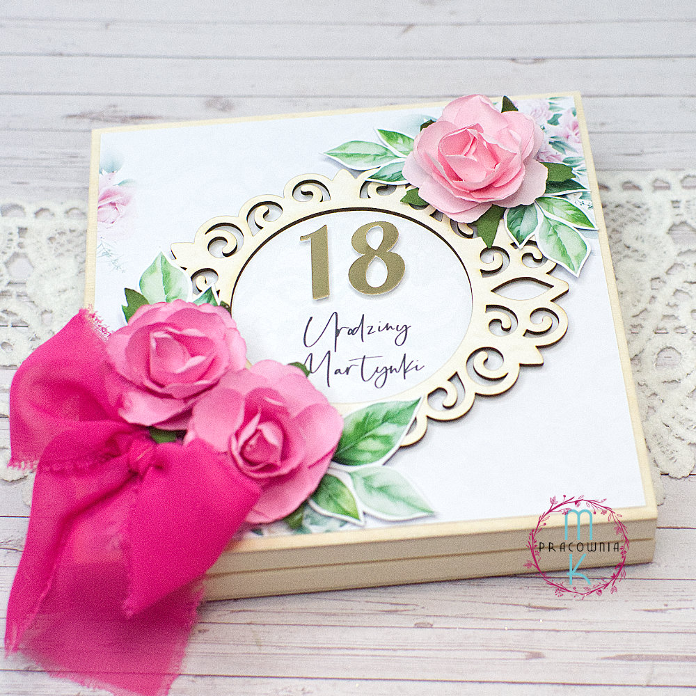 Na przodzie pudełka umieszczam liczbę lat oraz imię solenizantki, a wieczko ozdabiam różami w odcieniach różu. Całość dopełnia ozdobna wstążka, która nadaje pamiątce elegancki i spójny wygląd.