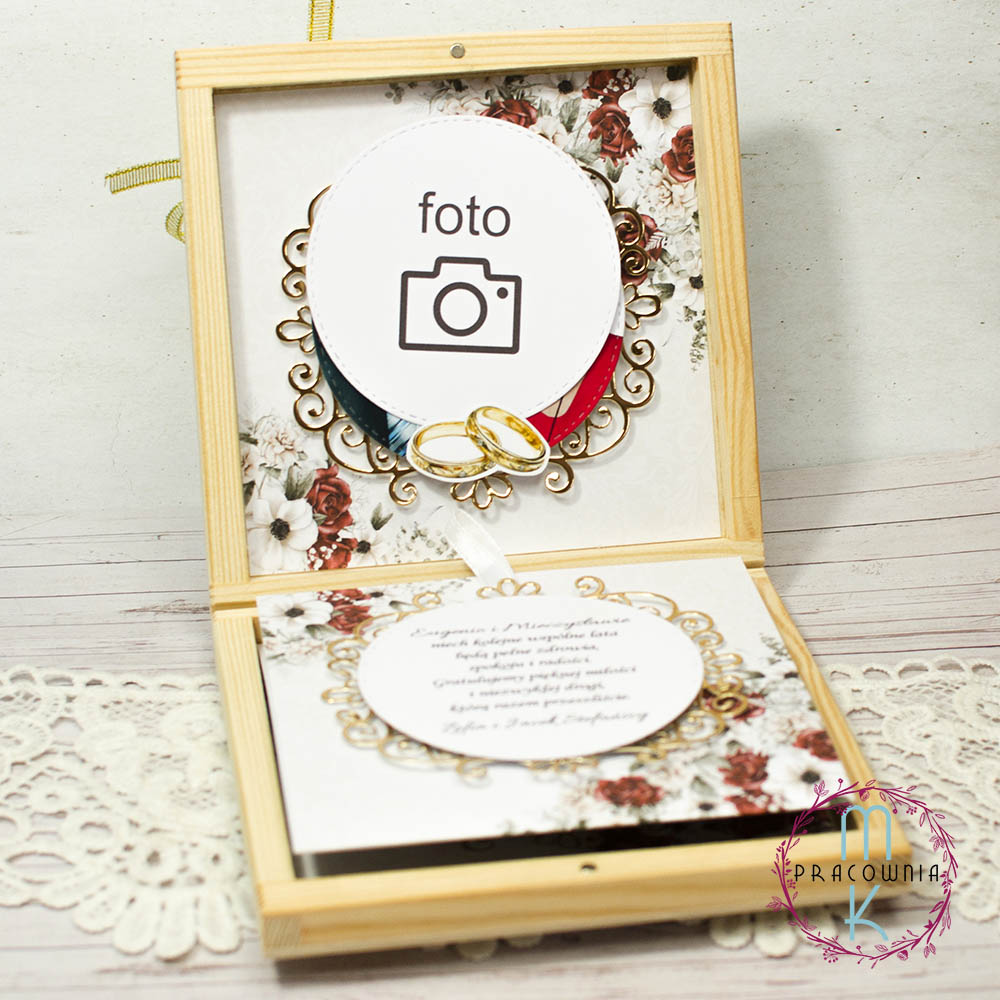 Unikalne drewniane pudełko o wymiarach ok. 14,5 x 14,5 cm, stworzone jako niezapomniana pamiątka z okazji rocznicy ślubu. Ozdobione wysokiej jakości papierem dekoracyjnym (gramatura 220-250g) zarówno na zewnątrz, jak i w środku, zachwyca elegancją i wyjątkową dbałością o detale.