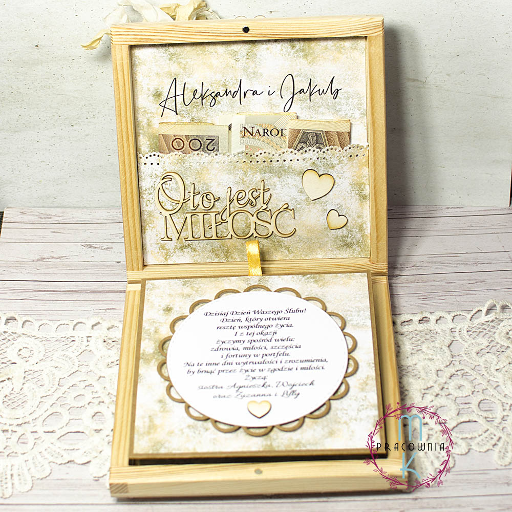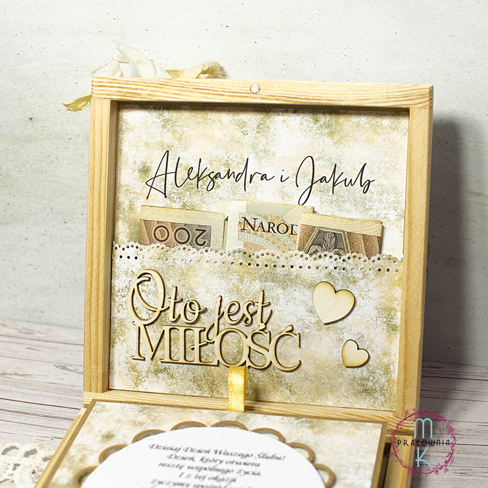 Unikalne drewniane pudełko o wymiarach ok. 14,5 x 14,5 cm, stworzone jako niezapomniana pamiątka z okazji ślubu. Ozdobione wysokiej jakości papierem dekoracyjnym (gramatura 220-250g) zarówno na zewnątrz, jak i w środku, zachwyca elegancją i wyjątkową dbałością o detale.