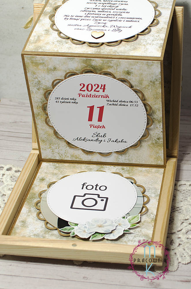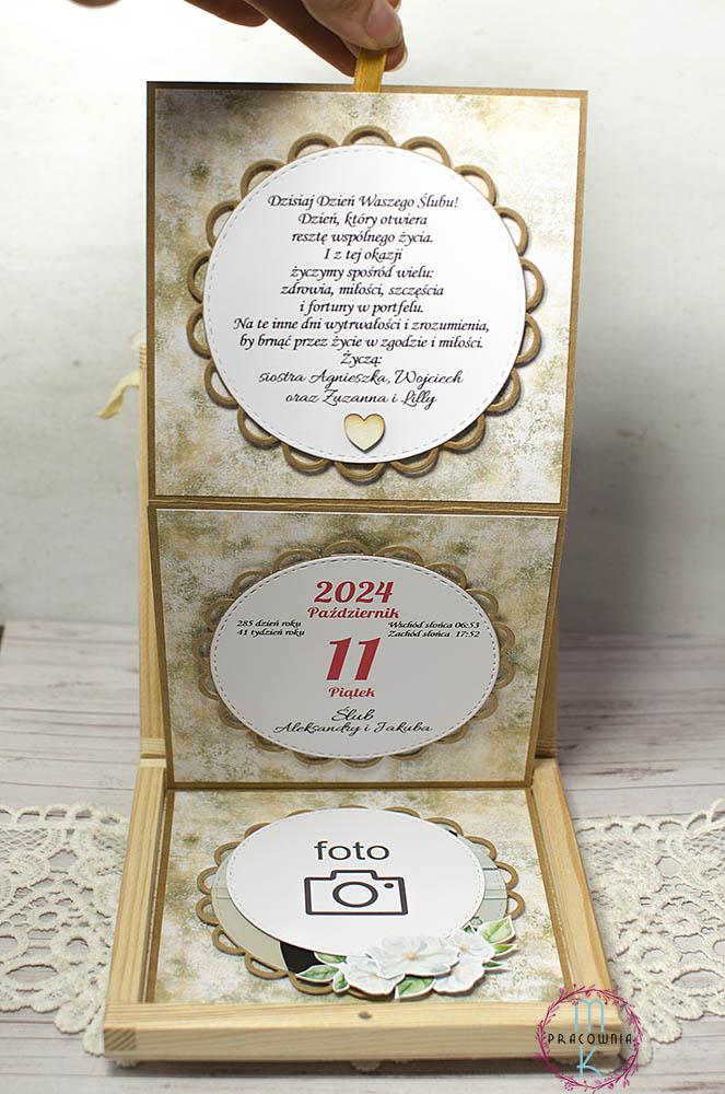 Kaskadowy box – po otwarciu za pomocą wstążki wysuwają się kolejne elementy ukazujące kartkę z kalendarza, życzenia, zdjęcie młodych albo grafiki związane ze ślubem