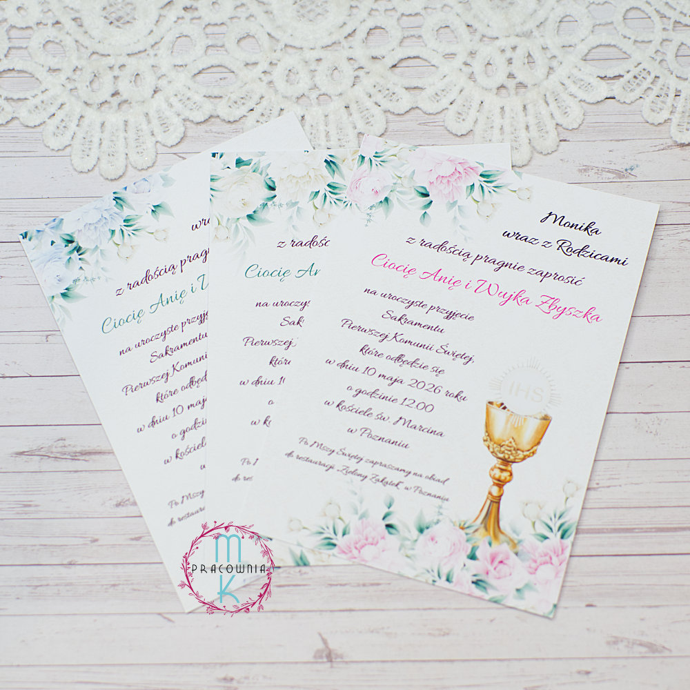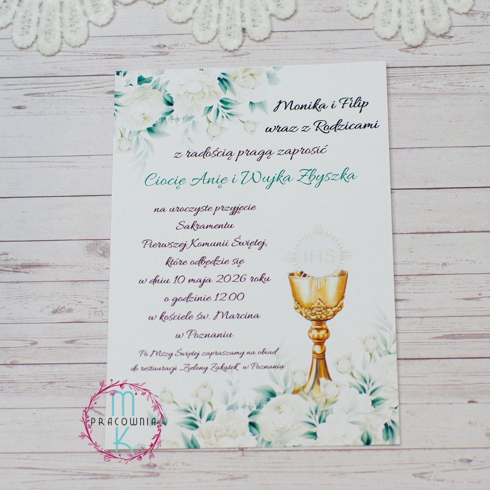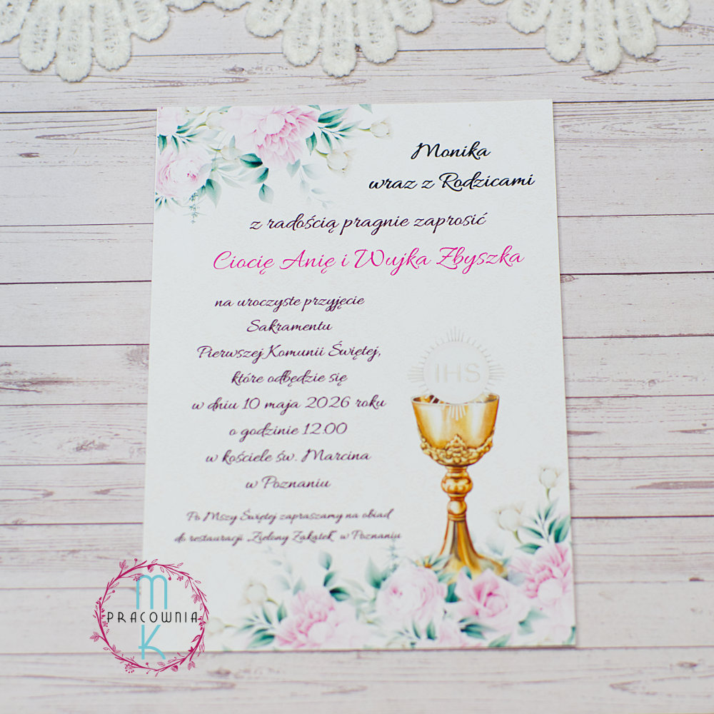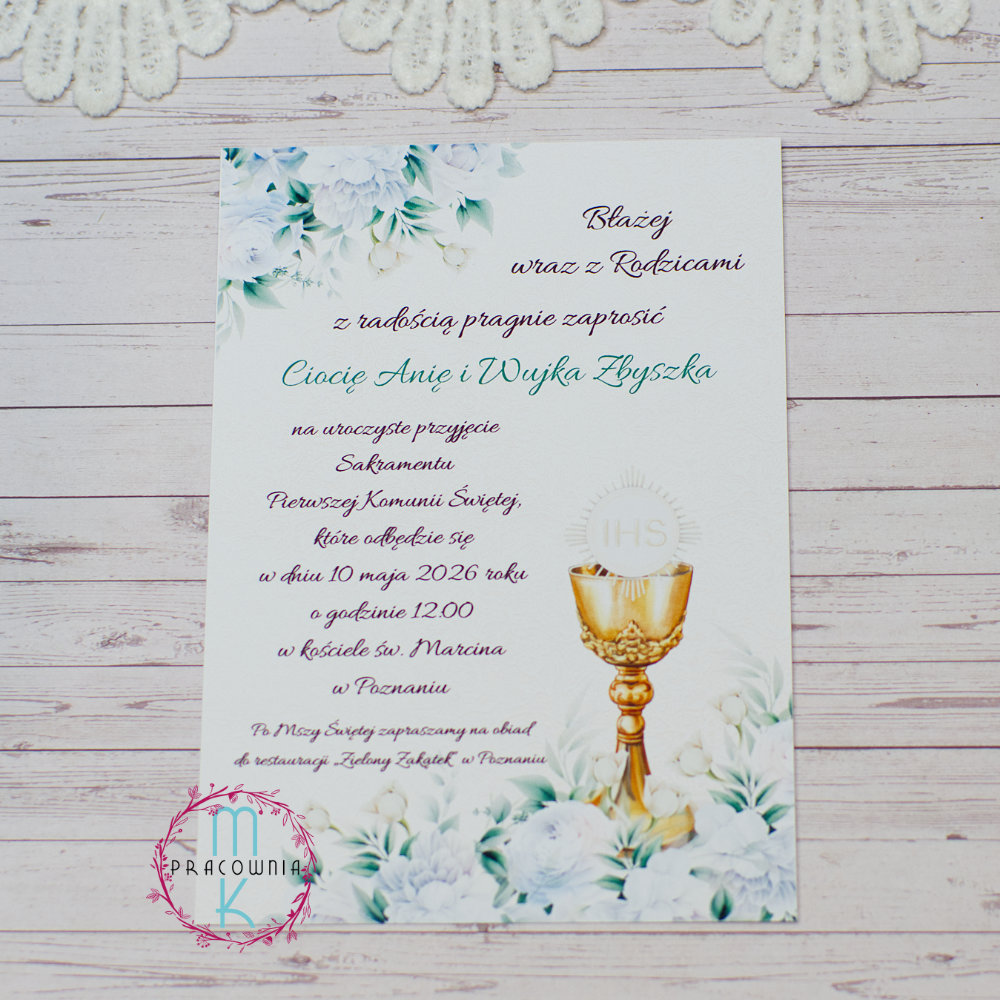 Eleganckie i subtelne jednokartkowe zaproszenia na Pierwszą Komunię Świętą, zaprojektowane z myślą o wyjątkowym charakterze tej uroczystości. Centralnym motywem zaproszenia jest kielich z hostią, uzupełniony delikatnymi kwiatami, które nadają całości lekkości i uroczystego wyglądu.