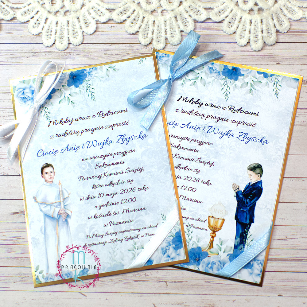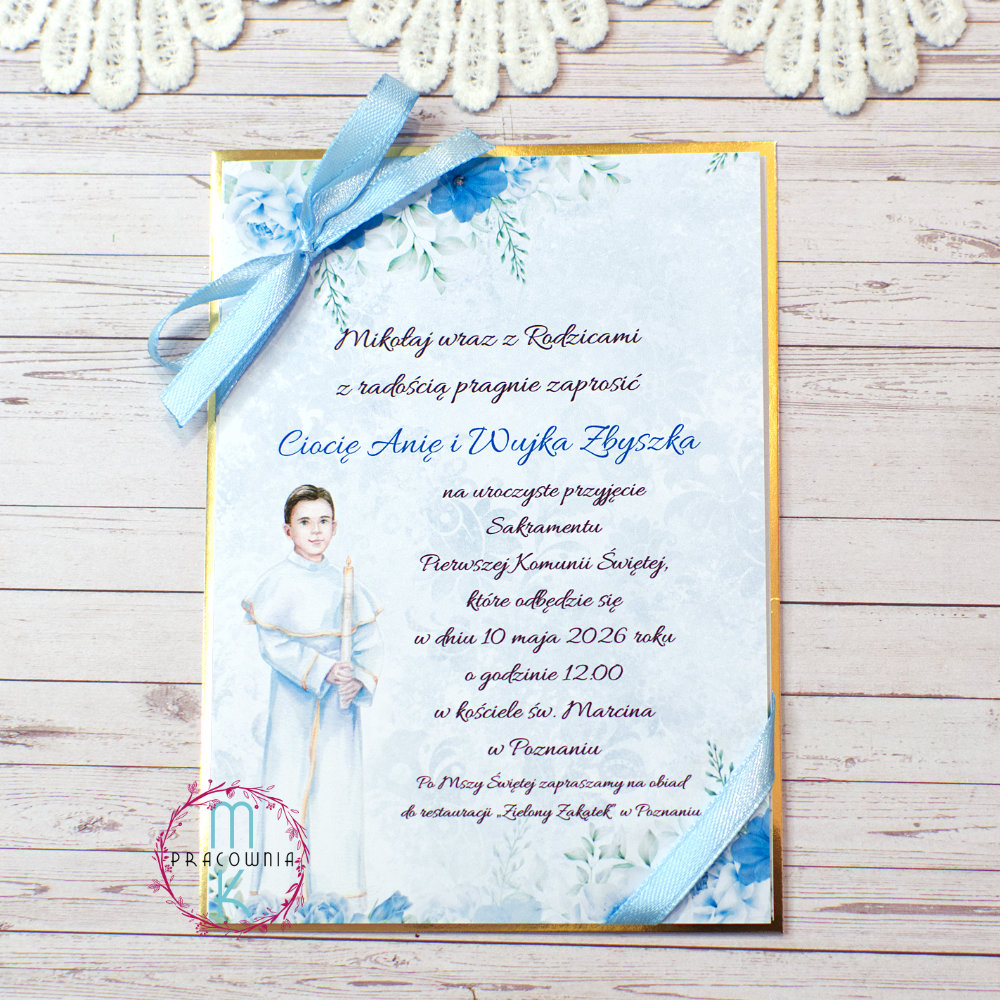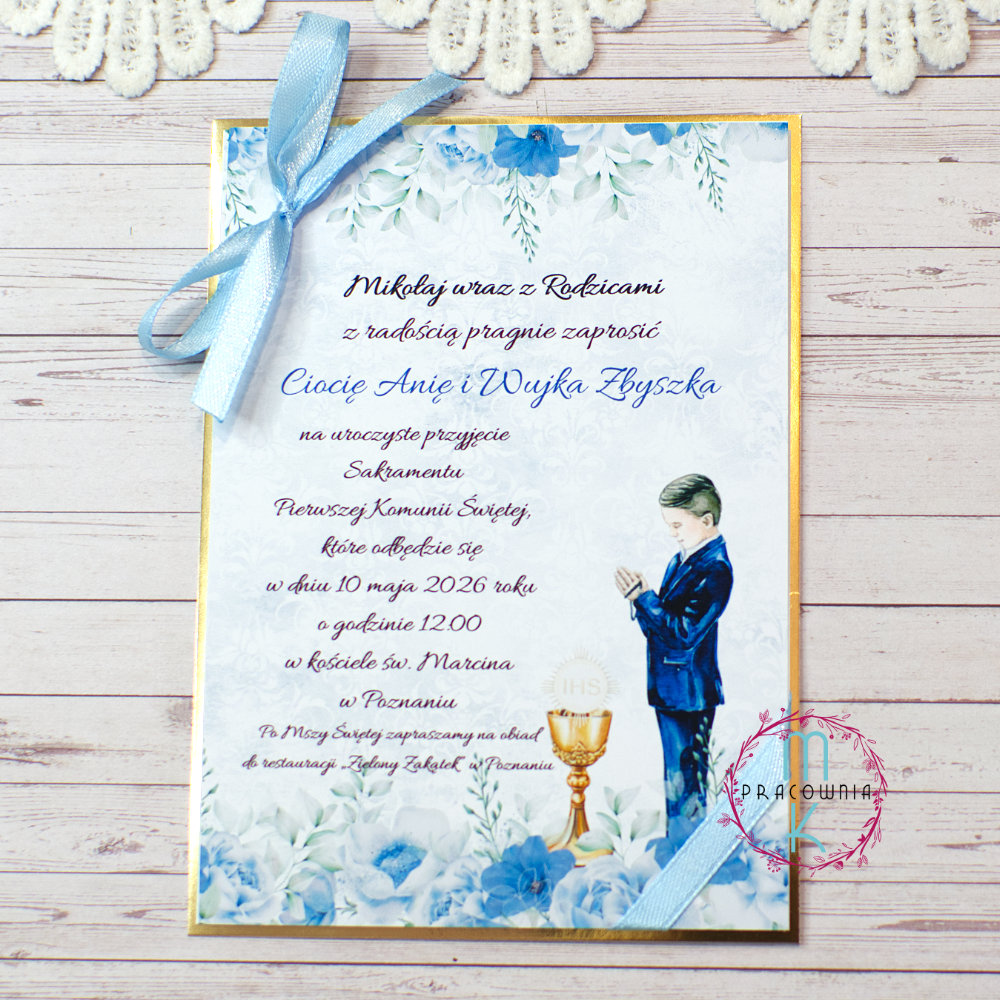 Jednokartkowe zaproszenia na Komunię Świętą niebieskie z chłopcem komunijnym ze wstążką