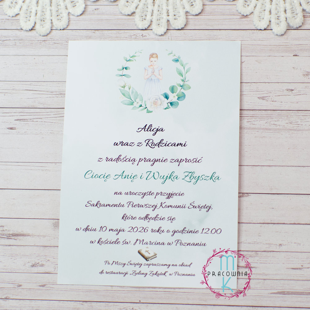 Jednokartkowe zaproszenia na Komunię Świętą z postacią komunijną