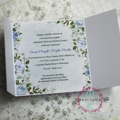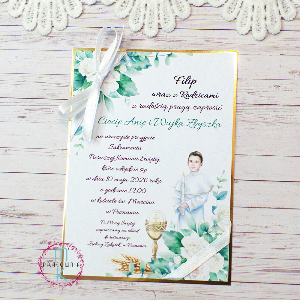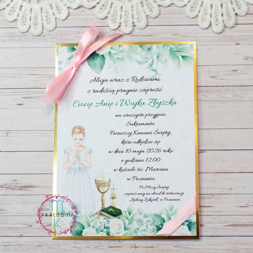 Zaproszenie osadzone jest w ramce z papieru lustrzane złoto, która pięknie podkreśla komunijny charakter projektu i dodaje mu elegancji. Całość przewiązana jest delikatną wstążką, dopasowaną kolorystycznie do wybranego wariantu kwiatów.