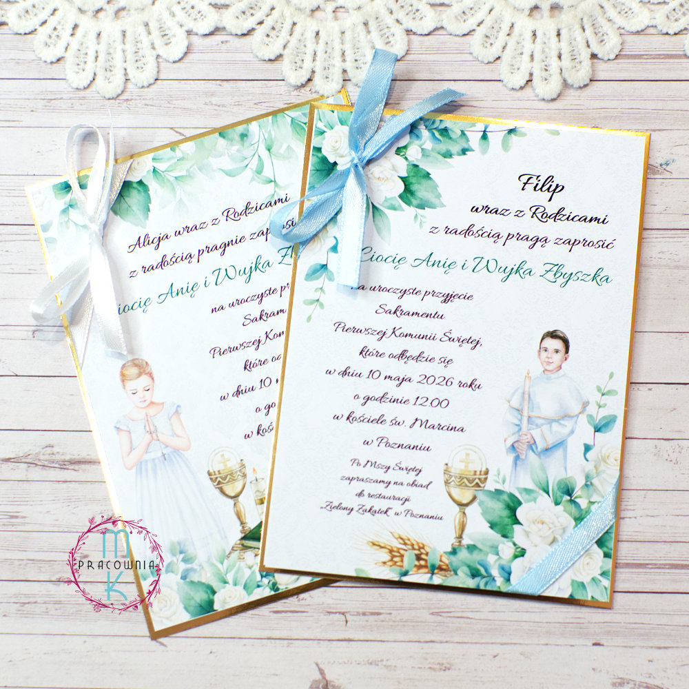 Eleganckie i subtelne jednokartkowe zaproszenia na Pierwszą Komunię Świętą, zaprojektowane z myślą o wyjątkowym charakterze tej uroczystości. Motywem zaproszenia jest postać komunijna chłopca albo dziewczynki do wyboru, uzupełniony delikatnymi kwiatami, które nadają całości lekkości i uroczystego wyglądu.