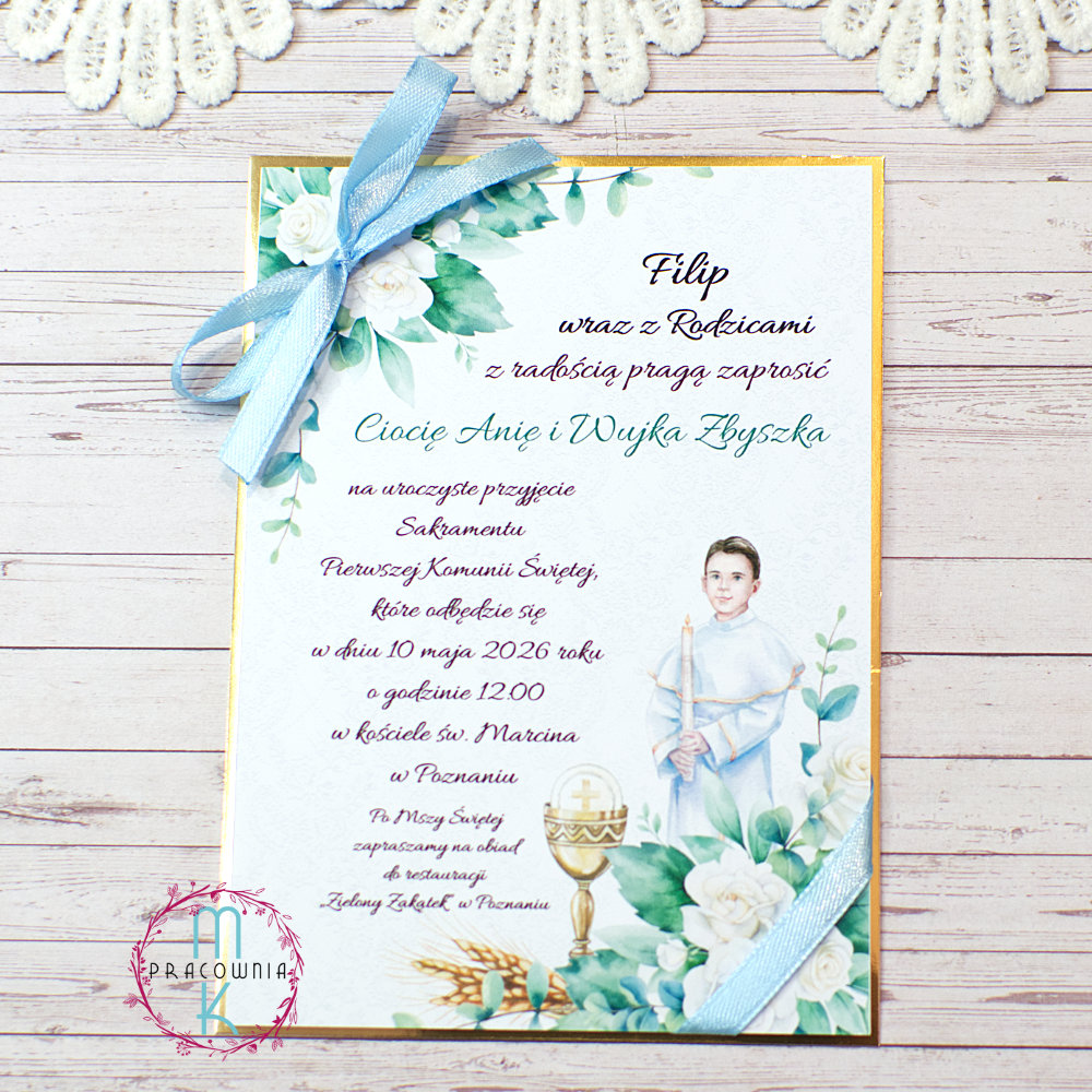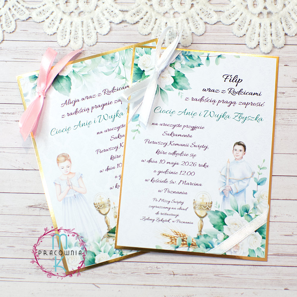 Jednokartkowe zaproszenia z postacią komunijną i wstążką