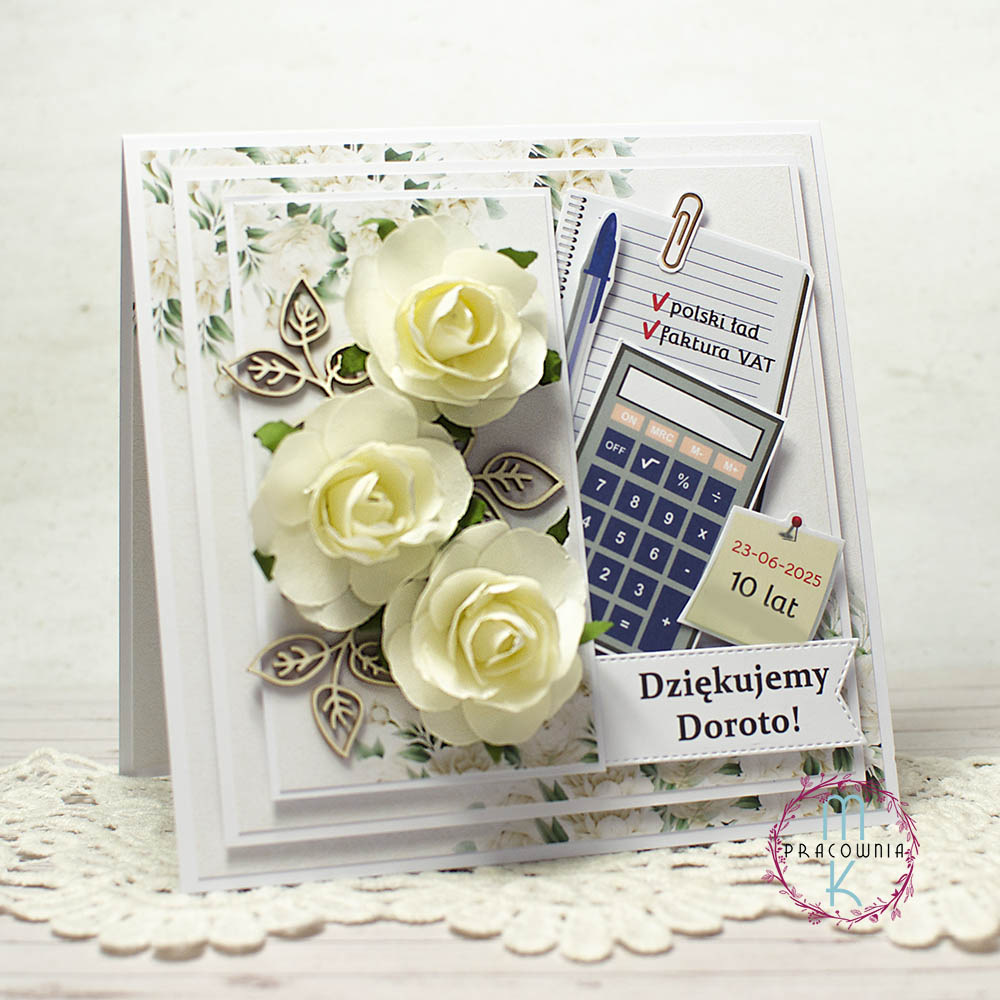 - Kartka wielowarstwowa na dystansach dzięki czemu praca jest przestrzenna, zawiera wystające róże
