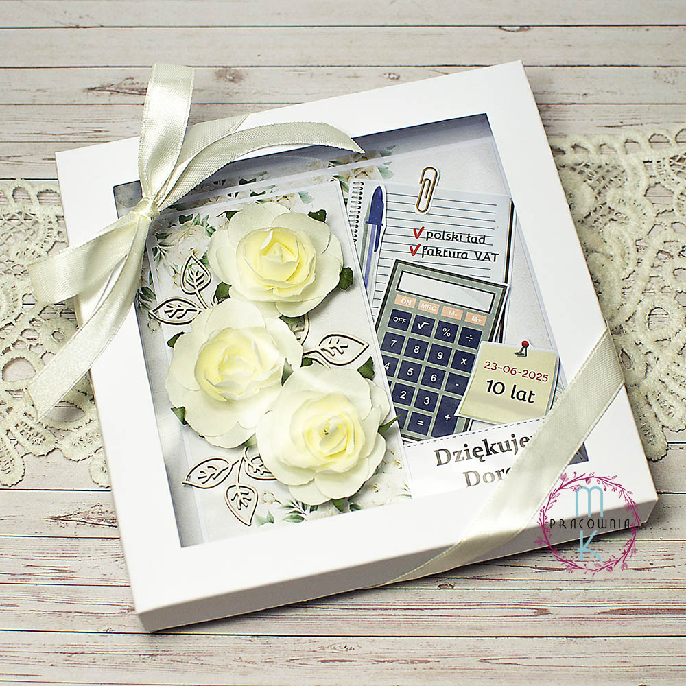 - Cena obejmuje kartkę, pudełko z okienkiem przewiązane wstążką.