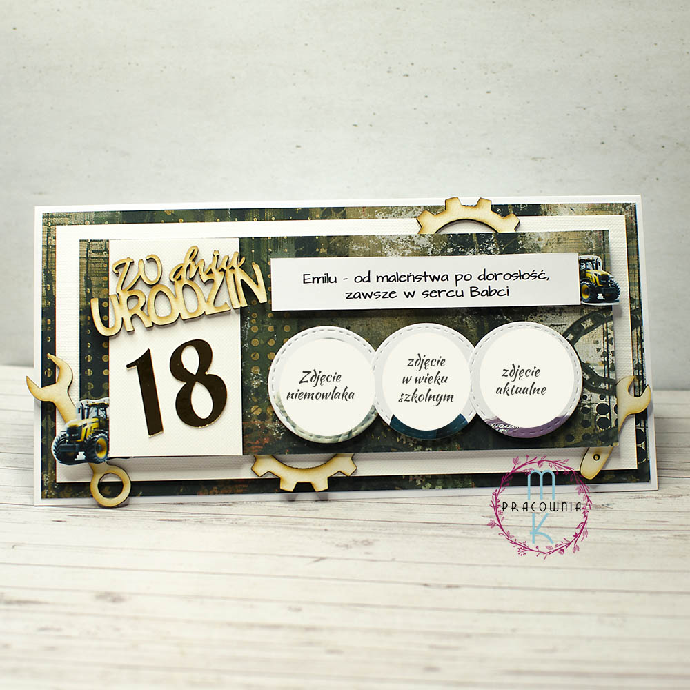 Kartka urodzinowa na 18 dla chłopca to wyjątkowa pamiątka stworzona z myślą o tej szczególnej okazji. Projekt łączy motyw traktorów (motyw można zmienić) co nadaje mu męski charakter.