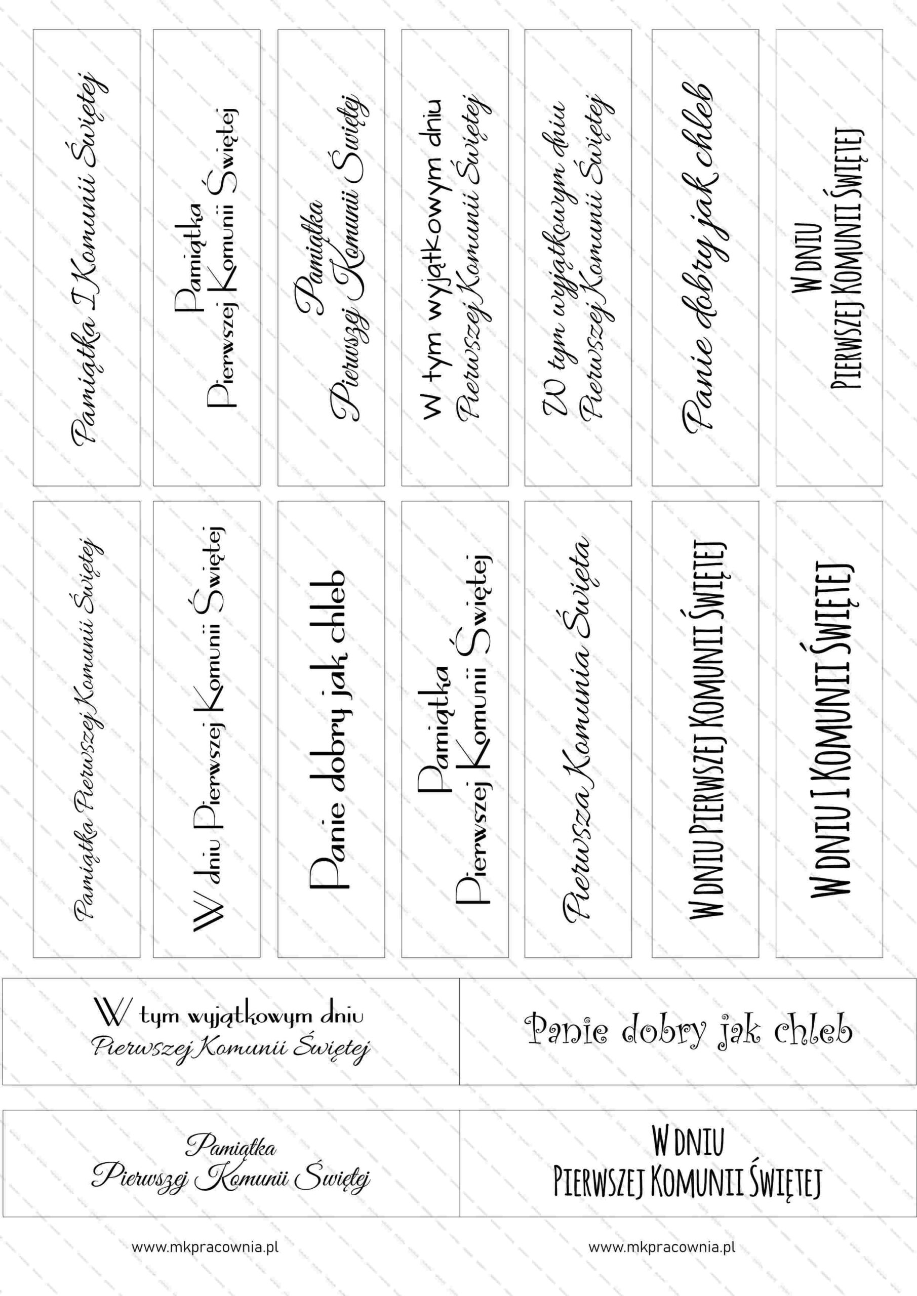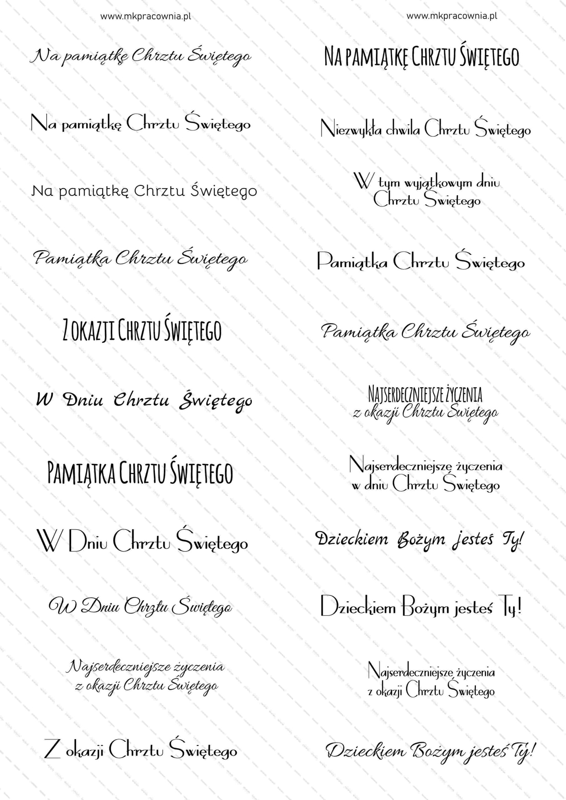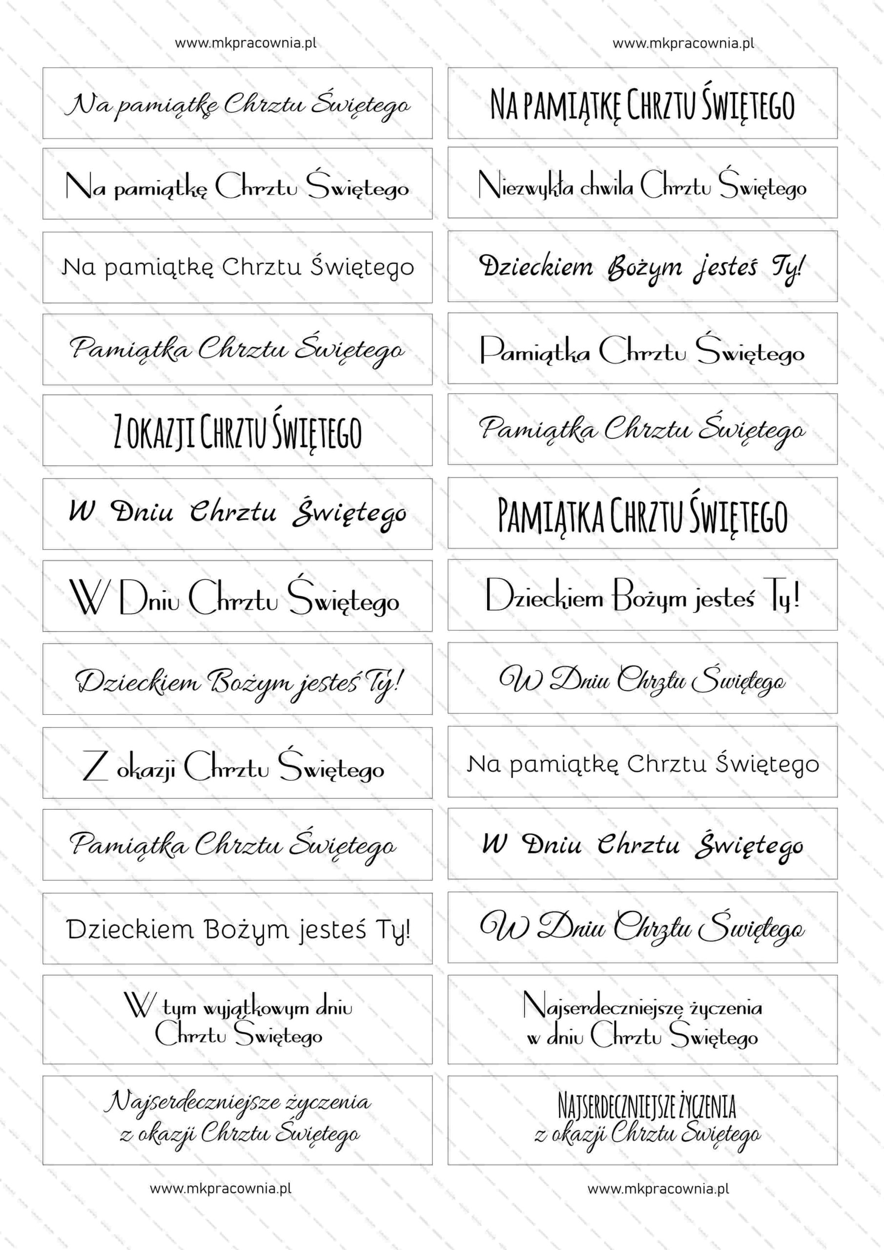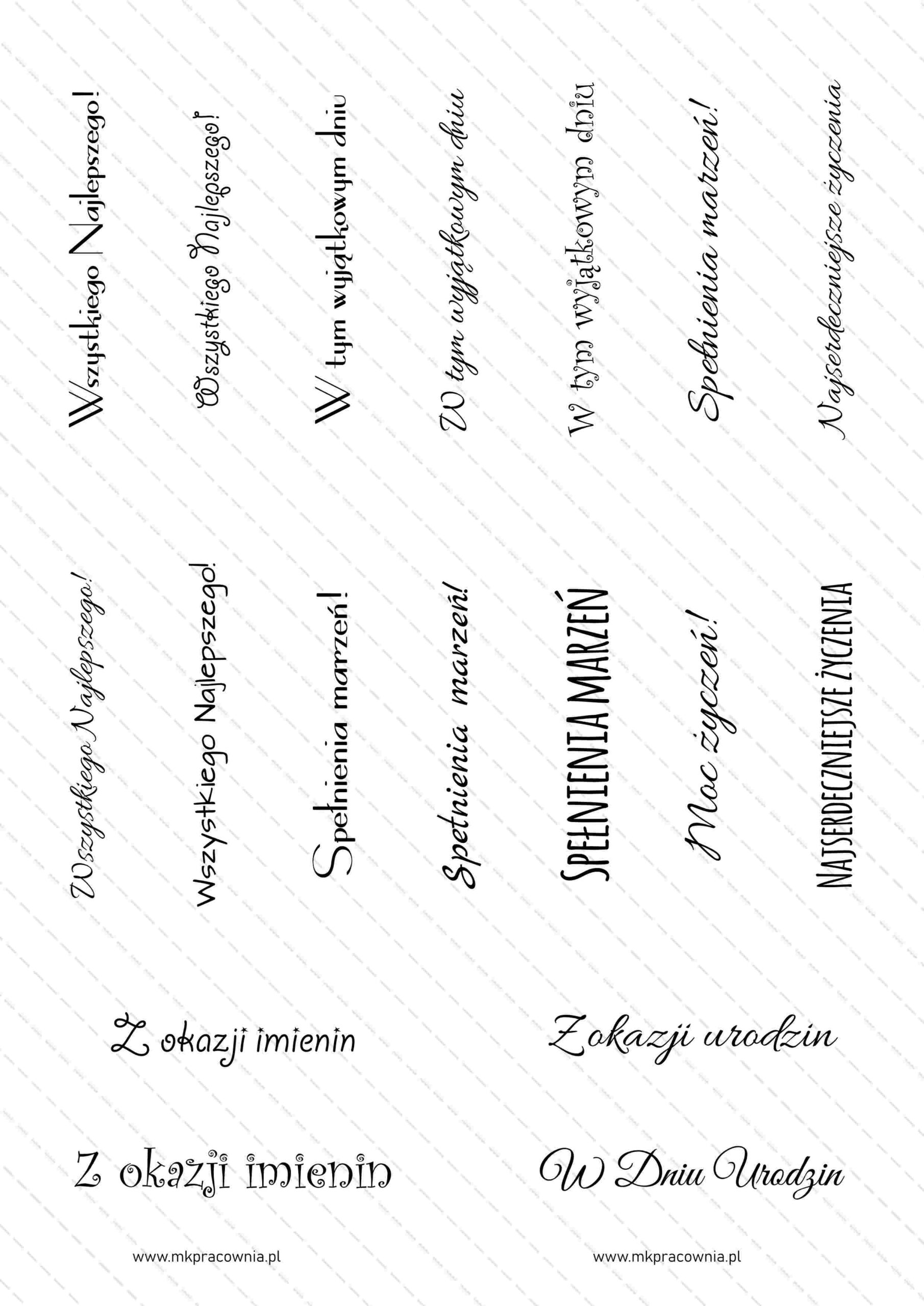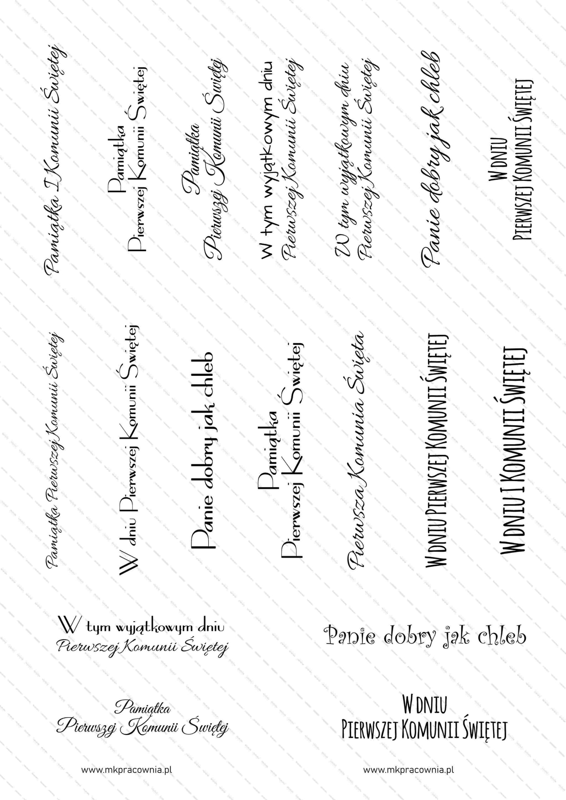 - Arkusz napisów do samodzielnego wydruku – napisy na urodziny\imieniny, chrzest, komunię świętą, Boże Narodzenie, Święta Wielkanocne, Dzień Babci i Dziadka, Dzień Matki i Ojca, Dzień Nauczyciela, Rocznicę Ślubu, z okazji Ślubu, Walentynki, Zakończenie szkoły/przedszkola, napisy Zaproszenie na Komunię Świętą – NAPISY na 12 różnych okazji