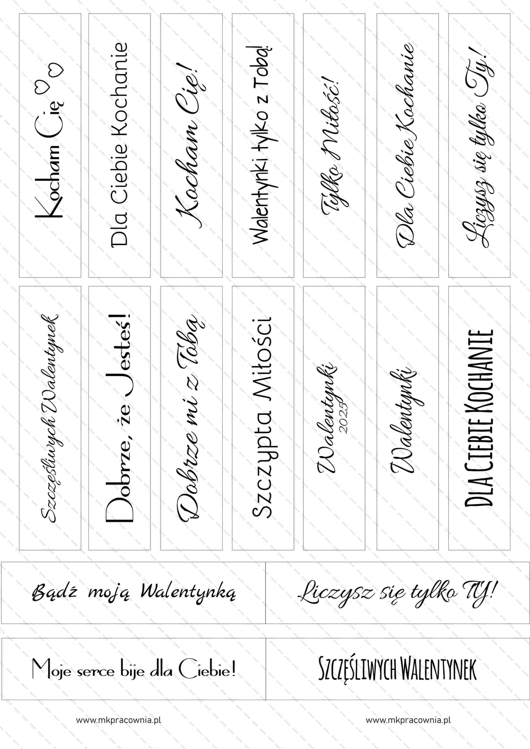 - Pliki PDF zawierają: arkusze gdzie jeden prostokąt z napisem ma wielkość ok 1,4 x 6 cm, arkusze gdzie jeden prostokąt z napisem ma wielkość ok 2,5 x 10,5 cm, arkusze bez ramek dzięki czemu możesz użyć do jego wycięcia wykrojniki albo inne narzędzia do wycinania.