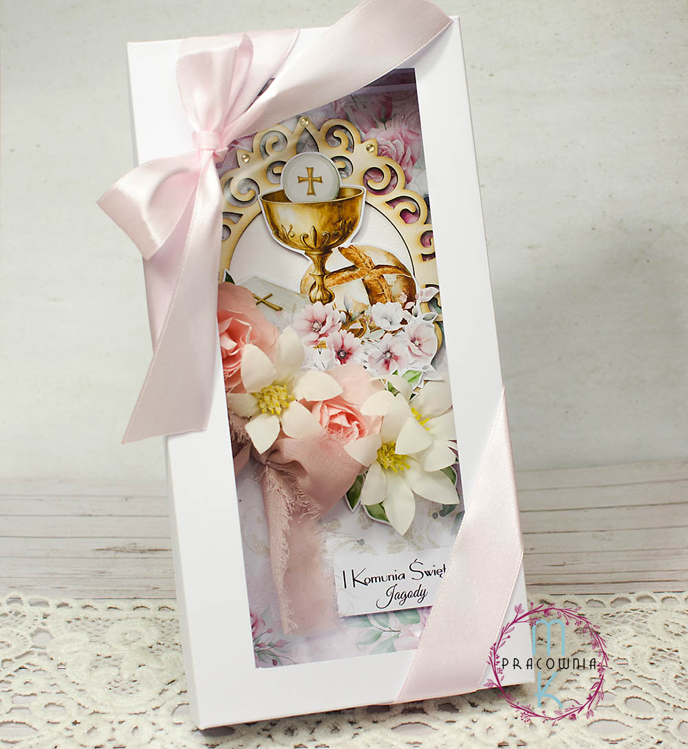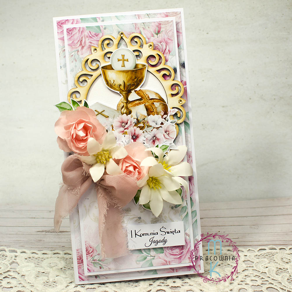 Elegancka, ręcznie wykonana kartka na Pierwszą Komunię Świętą w formacie DL (ok. 21,5 x 10,5 cm). Kartka utrzymana jest w subtelnej różowej kolorystyce z dekoracyjnymi, przestrzennymi kwiatami 3D, które nadają jej wyjątkowego uroku i delikatności.