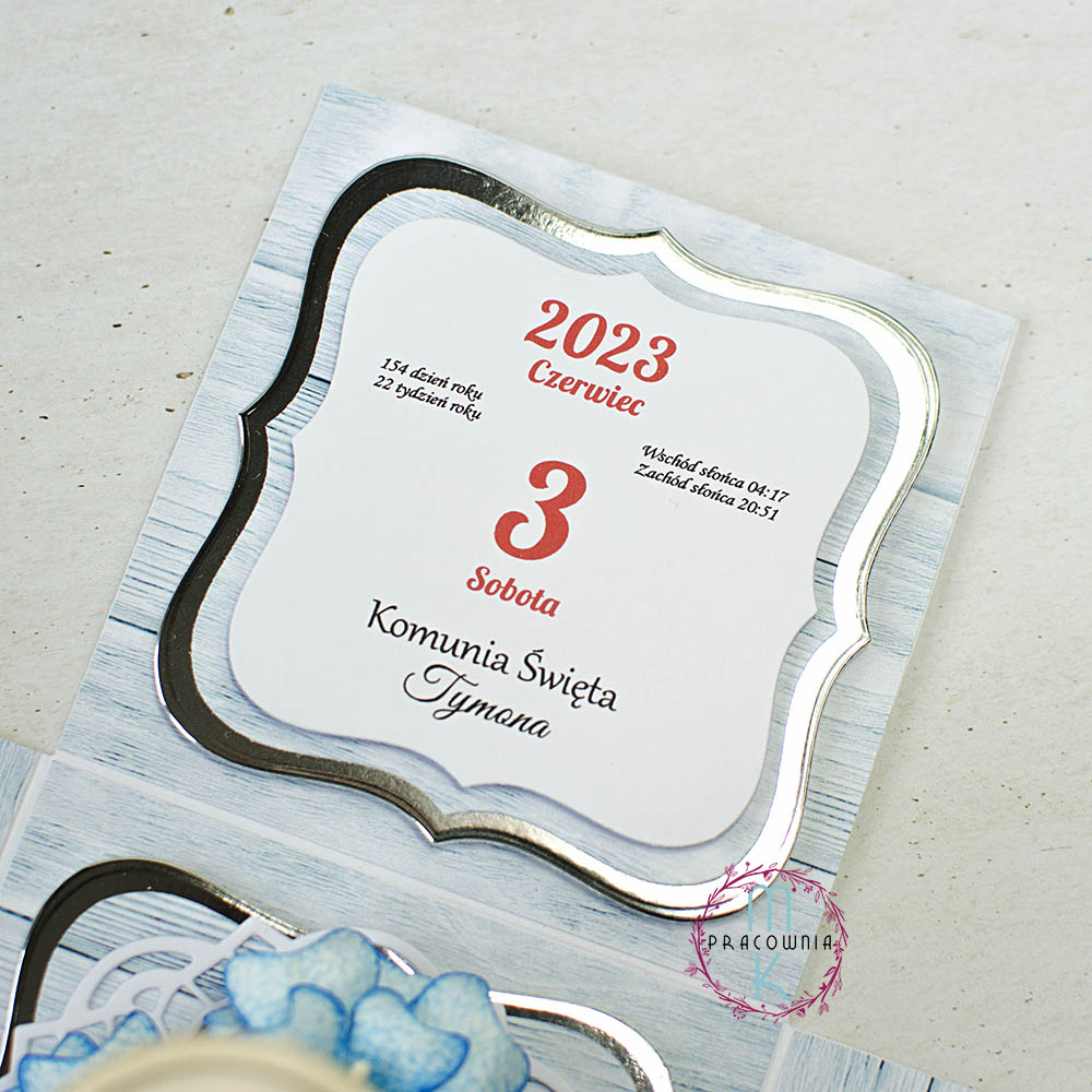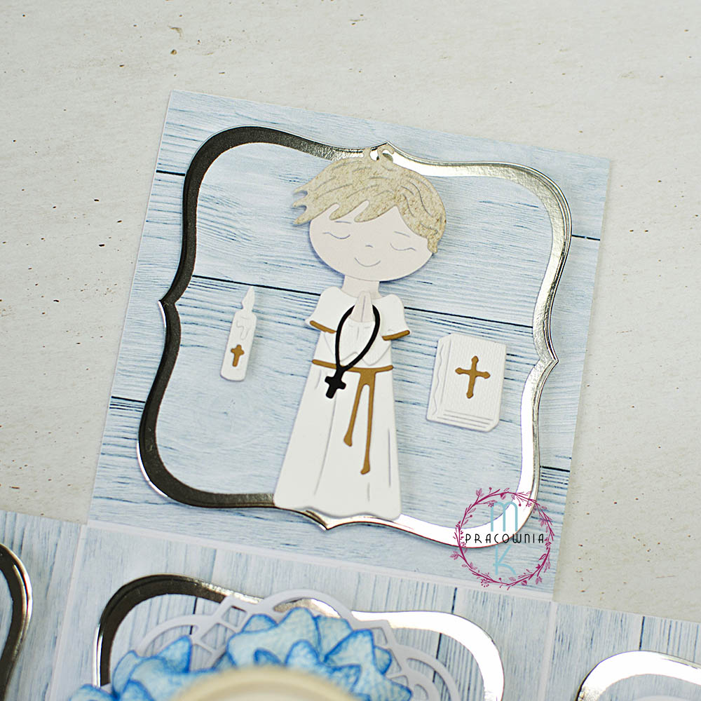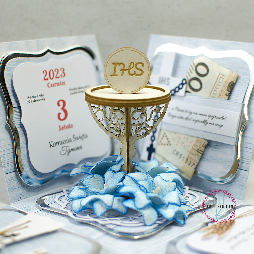 - Na bocznych ściankach standardowo znajdują się takie elementy jak: życzenia, kartka z kalendarza, postać komunijna chłopca (możliwość wybrania koloru włosów – uzgadniane po złożeniu zamówienia albo zdjęcie dziecka) oraz miejsce na pieniądze (jeśli jest potrzebne)