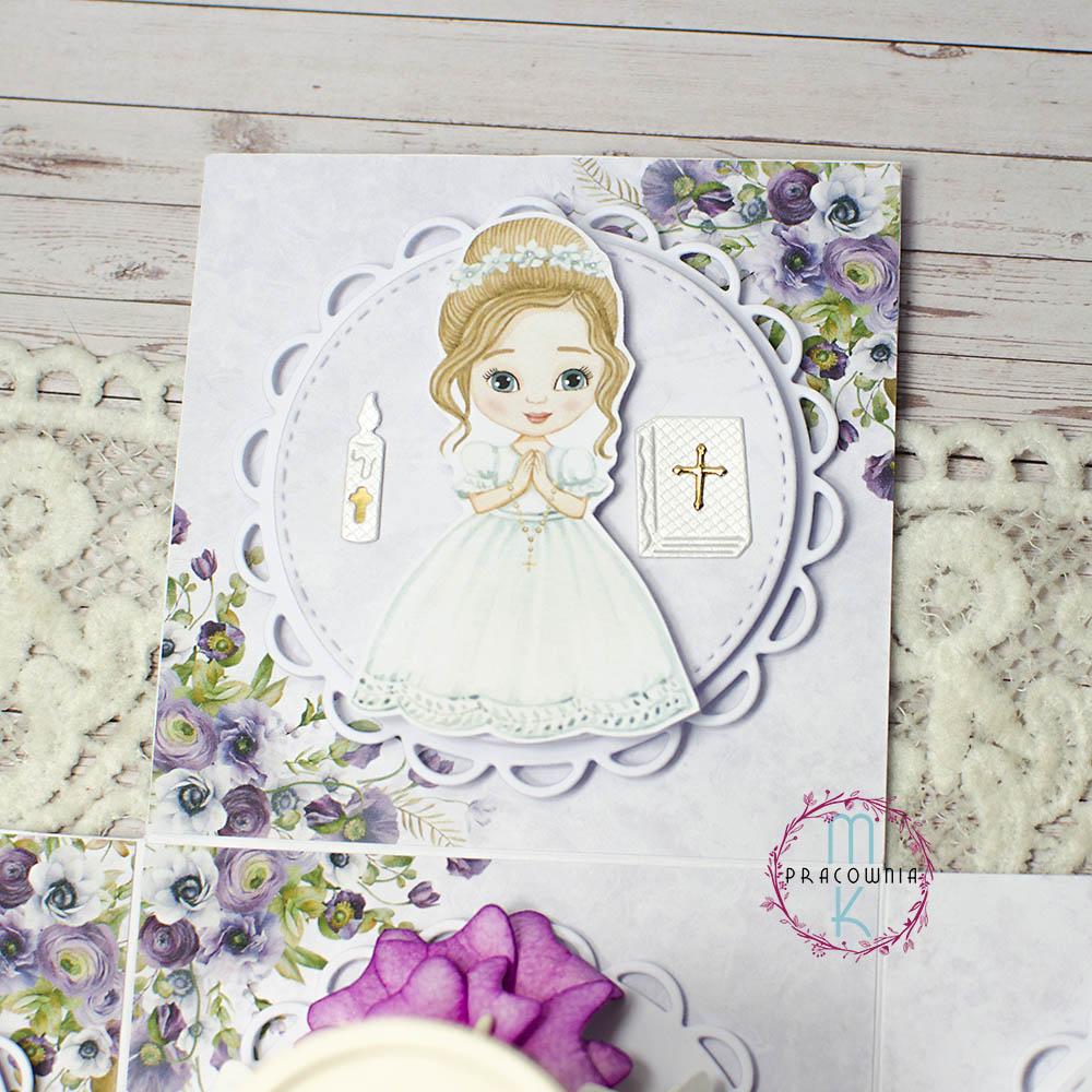 - Na bocznych ściankach standardowo znajdują się takie elementy jak: życzenia, kartka z kalendarza, postać komunijna dziewczynki albo zdjęcie dziecka oraz miejsce na pieniądze
