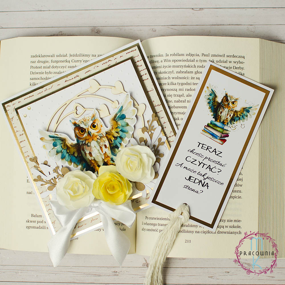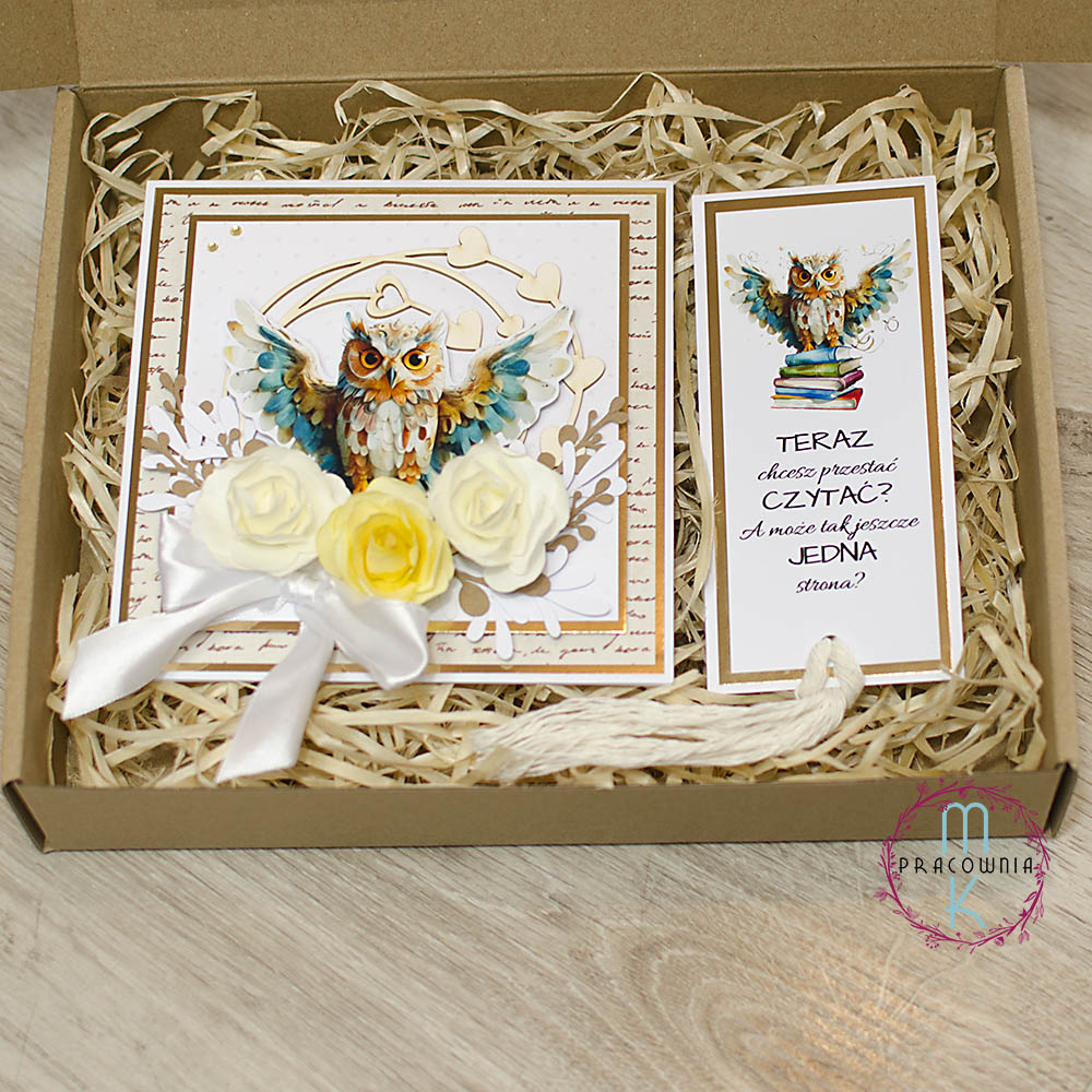 W elegancko zapakowanym pudełku znajduje się kartka oraz zakładka do książki – wszystko ozdobione uroczym motywem sowy