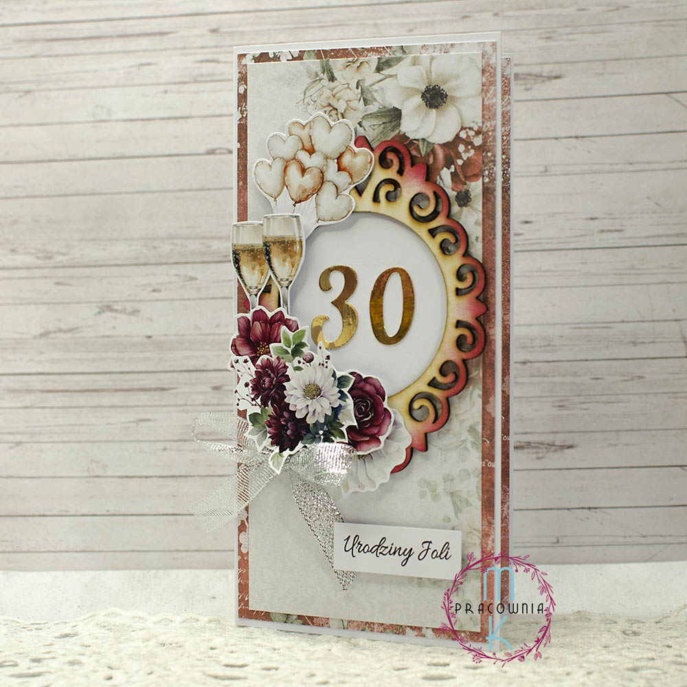 Kartka urodzinowa w formacie DL (ok. 21 x 10,5 cm), wykonana z wysokiej jakości papieru o gramaturze 300 g oraz ozdobnych dodatków. Kartka nie jest płaska – przestrzenność nadają jej delikatnie podniesione elementy oraz ramka z beermaty wokół cyfry „30” (istnieje możliwość personalizacji liczby – dopasuję ją do wieku jubilata).
