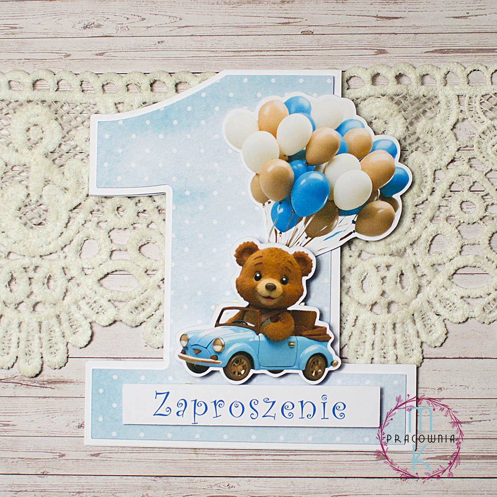Urocze, ręcznie robione zaproszenie z misiem w samochodziku, idealne roczek! Wykonane z wysokiej jakości papieru o gramaturze 250 – do wyboru baza kraftowa (naturalny, ekologiczny wygląd) lub biała.