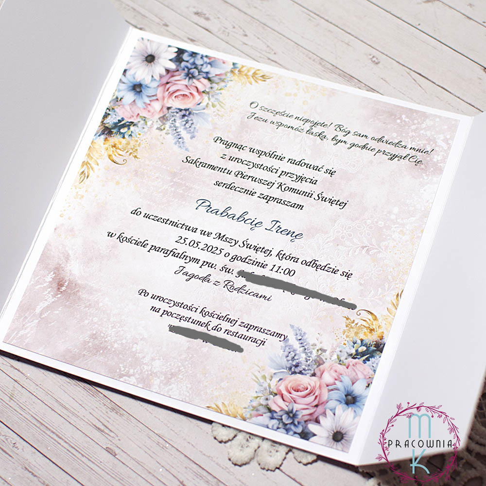 - Cena obejmuje zaproszenia, kopertę oraz pełną personalizację zaproszenia zarówno na pierwszej stronie, jak i w środku. Treść zaproszenia jest uzgadniana po złożeniu zamówienia. Otrzymają Państwo osobnego emaila