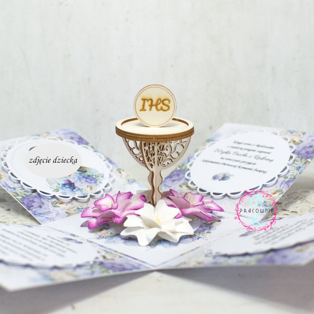 - Na bocznych ściankach standardowo znajdują się takie elementy jak: treść zaproszenia, imiona osób które zostają zaproszone, cytat, zdjęcie dziecka albo postać komunijna dziewczynki lub chłopca (możliwość wybrania koloru włosów – uzgadniane po złożeniu zamówienia)