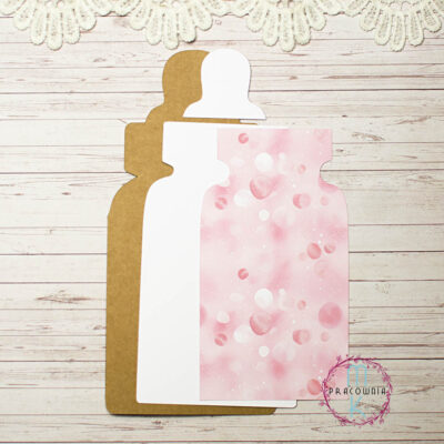 5.18złBaza kartki wykonana z papieru kraft o gramaturze 250. Rozmiar : ok 21 x 9,7 cm Cena obejmuje bazę w kształcie butelki dziecięcej Baza kartki otwiera się w bok W zestawie z bazą otrzymasz dodatkowy biały papier pomniejszony od bazy oraz różowy papier, który jest pomniejszony od białego dzięki czemu tworzy dodatkową warstwę UWAGA! Kolory/odcienie…