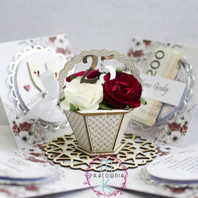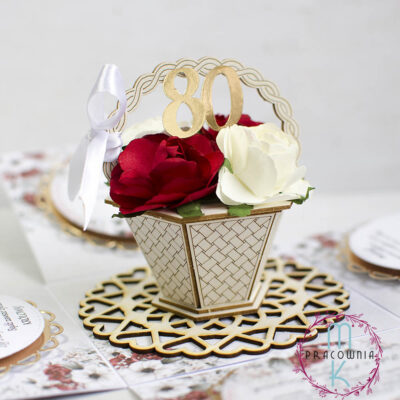 Pudełko o wymiarach ok: 10 x 10 x 10 cm wykonane na wysokiej jakości  papieru o gramaturze 350 Gdy ściągniemy wieczko pudełka – wówczas boczne ścianki opadają ukazując treść + element 3 D będący koszem z kwiatami. W pudełku mogę umieścić zdjęcie Jubilatów – proszę je przesłać na kontakt@mkpracownia.pl Na bocznych ściankach standardowo znajdują się…
