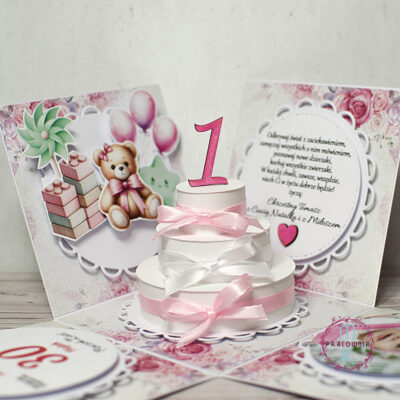 68.25złPudełko kaskadowe o wymiarach ok: 10 x 10 i wysokie 4 cm (nie licząc kwiatków) wykonane z wysokiej jakości papieru Gdy ściągniemy wieczko pudełka – za pomocą wstążki wyciągamy poszczególne elementy nawiązujące do 1 urodzin Na poszczególnych ściankach znajdują się takie elementy jakie jak: napis „Masz już roczek”, życzenia z miejscem na podpis, wierszyk dla…