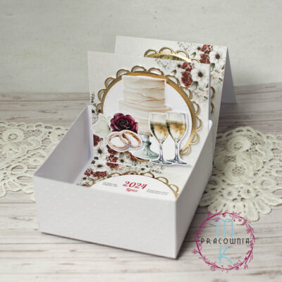 99.89złPudełko o wymiarach ok: 10 x 10 x 10 cm wykonane na wysokiej jakości papieru o gramaturze 350 Gdy ściągniemy wieczko pudełka – wówczas boczne ścianki opadają ukazując treść + element 3 D będący koszem z kwiatami. W pudełku mogę umieścić zdjęcie Jubilatów – proszę je przesłać na kontakt@mkpracownia.pl Na bocznych ściankach standardowo znajdują się…