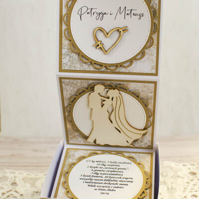 79.89złJeżeli szukasz pięknej i wyjątkowej pamiątki ślubnej, która wyróżnia się pośród innych to zapraszam Cię po box kaskadowy. Sprawdzi się on nie tylko na okoliczność ślubu ale również jako prezent na rocznice ślubu. Ten unikalny produkt wykonany jest z wysokiej jakości papieru i zawiera wyciągane elementy, które można z łatwością wysunąć za pomocą delikatnej wstążki….