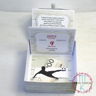 79.89złWykonam podobne pudełko jak na zdjęciach. Imię na koszulce zmienię na imię Jubilata, a nawet wiek – proszę o informację przy składaniu zamówienia Pudełko kaskadowe o wymiarach ok: 10 x 10 i wysokie 5 cm Gdy ściągniemy wieczko pudełka – za pomocą wstążki wyciągamy poszczególne elementy nawiązujące do zainteresowań Jubilata życzenia w środku są uzgadniane…