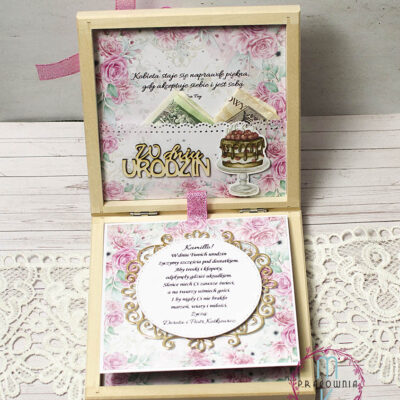 89.98złTa wyjątkowa pamiątka na 18 urodziny to elegancki i sentymentalny prezent, który tworzę z myślą o ważnych chwilach i wspomnieniach. Drewniane pudełko dekoruję ozdobnym papierem z dodatkiem różu, dzięki czemu całość zachwyca subtelnością i kobiecym charakterem. Choć projekt ten przygotowałam z okazji 18 urodzin, to mogę wykonać go również na dowolne urodziny, dopasowując liczbę i…