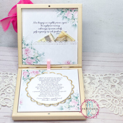 89.89złDrewniane otwierane pudełko o wymiarach około 14,5 x 14,5 cm jest ozdobione na zewnątrz i w środku papierem ozdobnym o wysokiej gramaturze (220-250g) Box kaskadowy posiada w środku dodatkowe elementy wyciągane za pomocą wstążki Cena obejmuje pudełko oraz pełną personalizację zarówno na pierwszej stronie, jak i w środku. Życzenia są do wyboru i uzgadniane po…